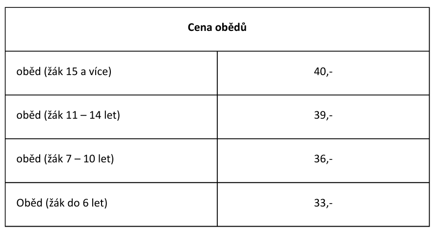Dle uvedené formy platby (hotovostní/behotovostní) při přihlášení k odběru jídel. Částka podle informací a pokynů jídelny.